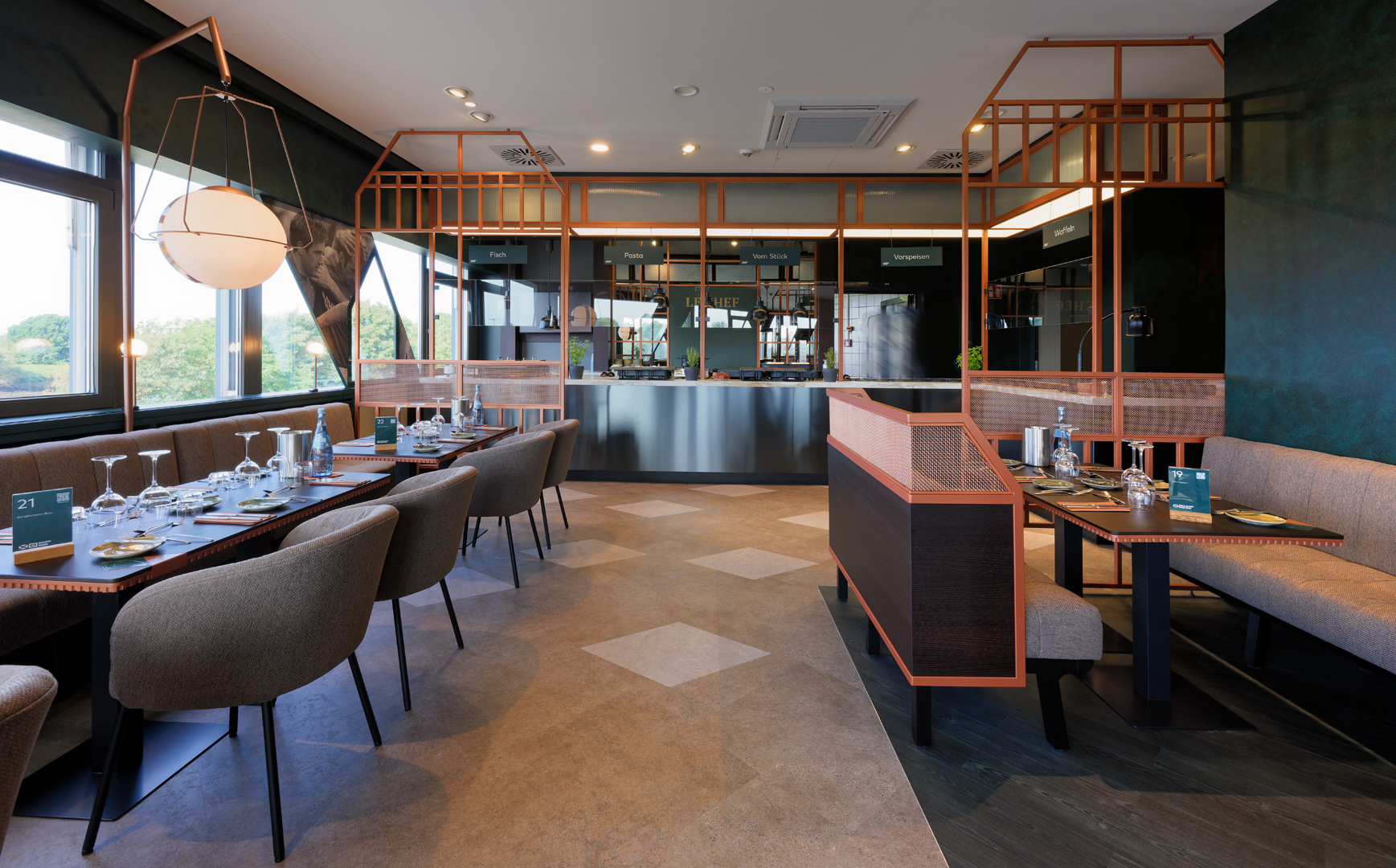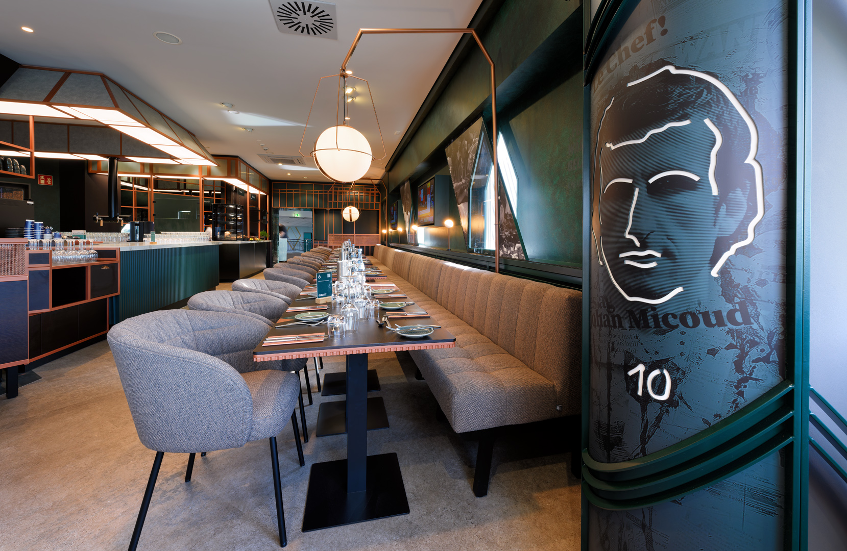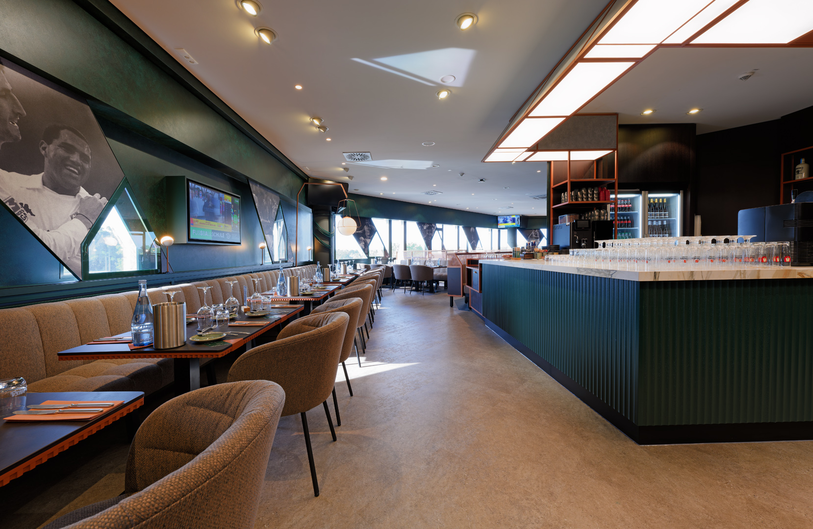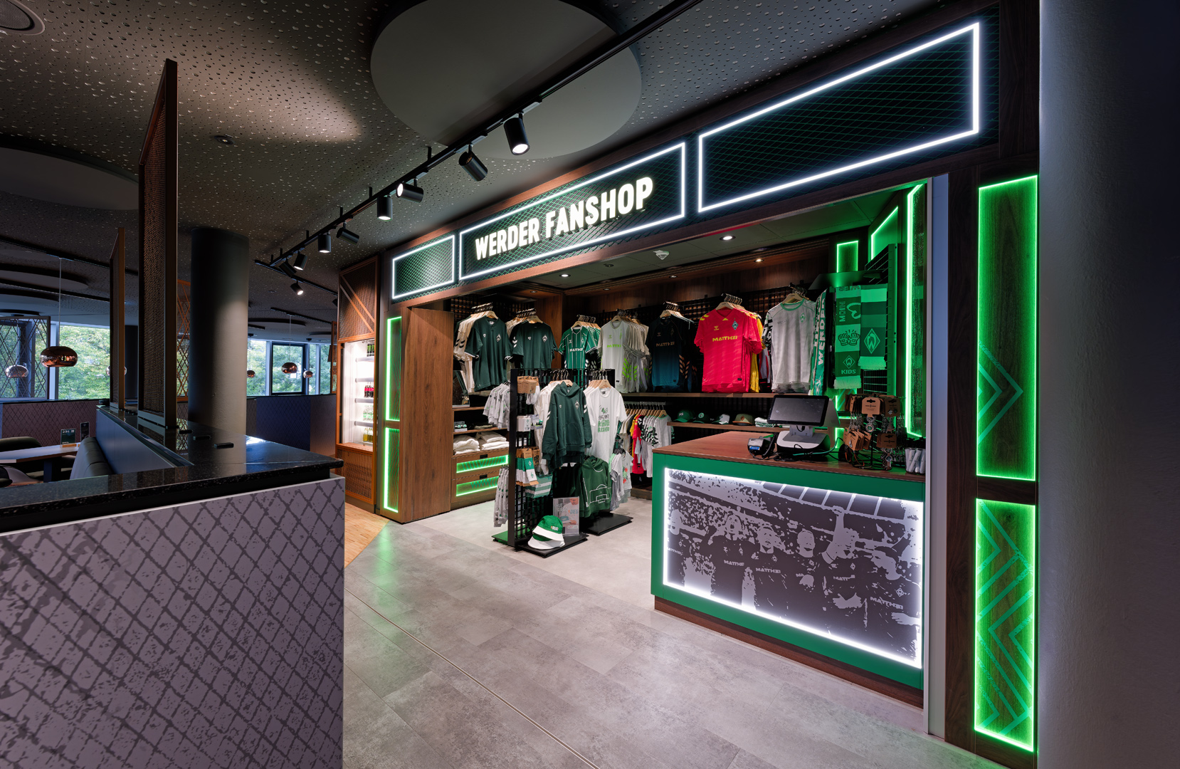 Die hochwertige Materialien wie Kupfer, Holz und Leder, wurden durch GKAD perfekt auf die Identität des Vereins abgestimmt und präzise verarbeitet für eine warme, moderne Atmosphäre. Die Planung sowie sämtliche Gewerkepläne wurden vollständig durch Tenbrink ausgeführt, wodurch eine reibungslose und effiziente Projektabwicklung gewährleistet war. Neben dem Innenausbau wurden auch die Sanitärräume und die Klimatechnik im „Le Chef“ grundlegend neu gestaltet. Zusätzlich durften wir eine neue, rund 8 × 8 Meter große Fanshopfläche exklusiv für die VIP-Gäste gestalten. Auf dieser Fläche verbindet sich ein modernes Markenbild mit funktionaler Präsentation, sodass ein hochwertiges Shopping-Erlebnis unmittelbar im Hospitality-Umfeld entsteht.
